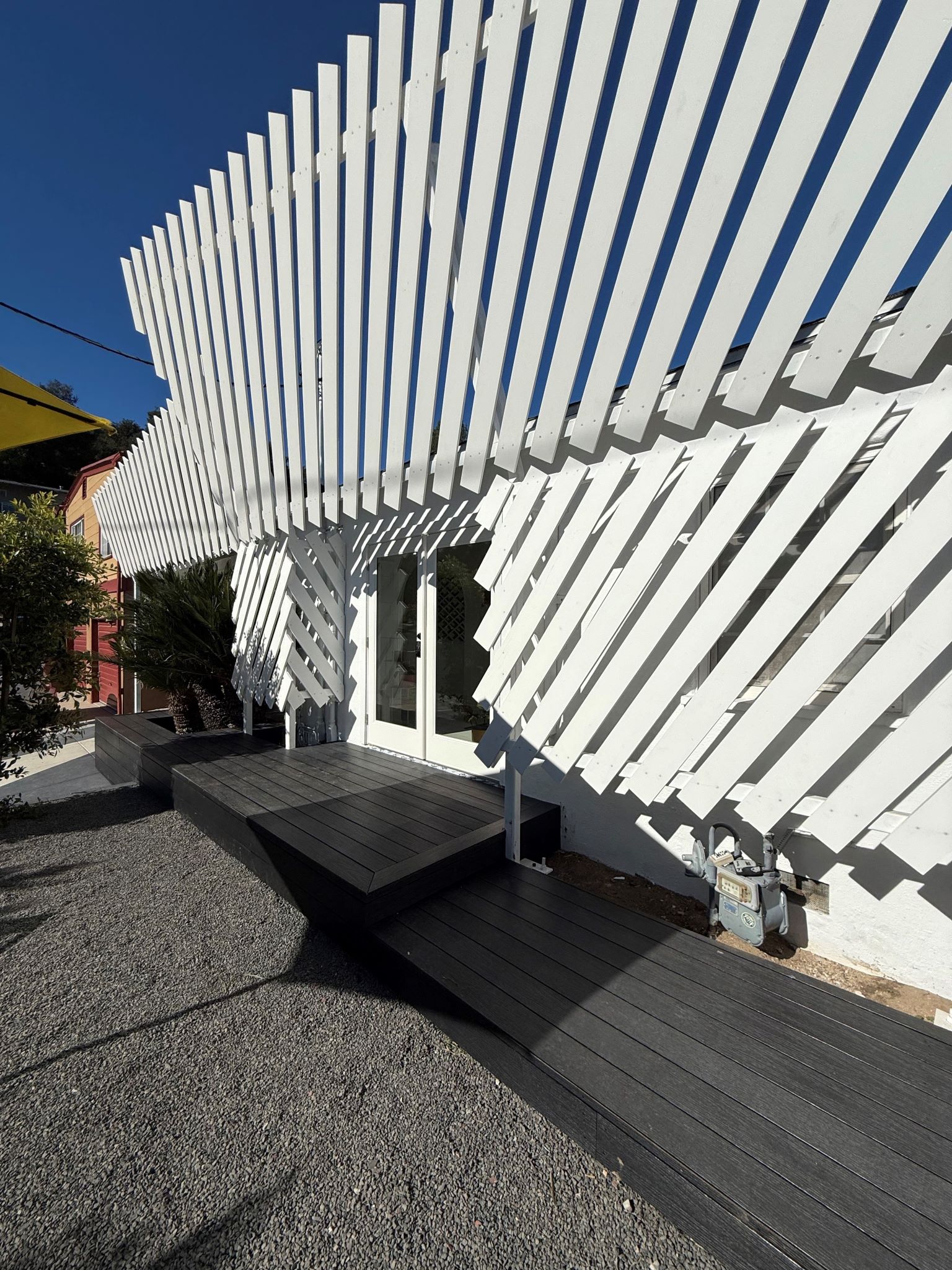 The outdoors is shaped with a Bougainvillea planted wall, murals, expansive new fire-resilient deck which resolves many levels of the existing garden, and the overhead trellis. This intervention transforms a part of the garden into an outdoor room.