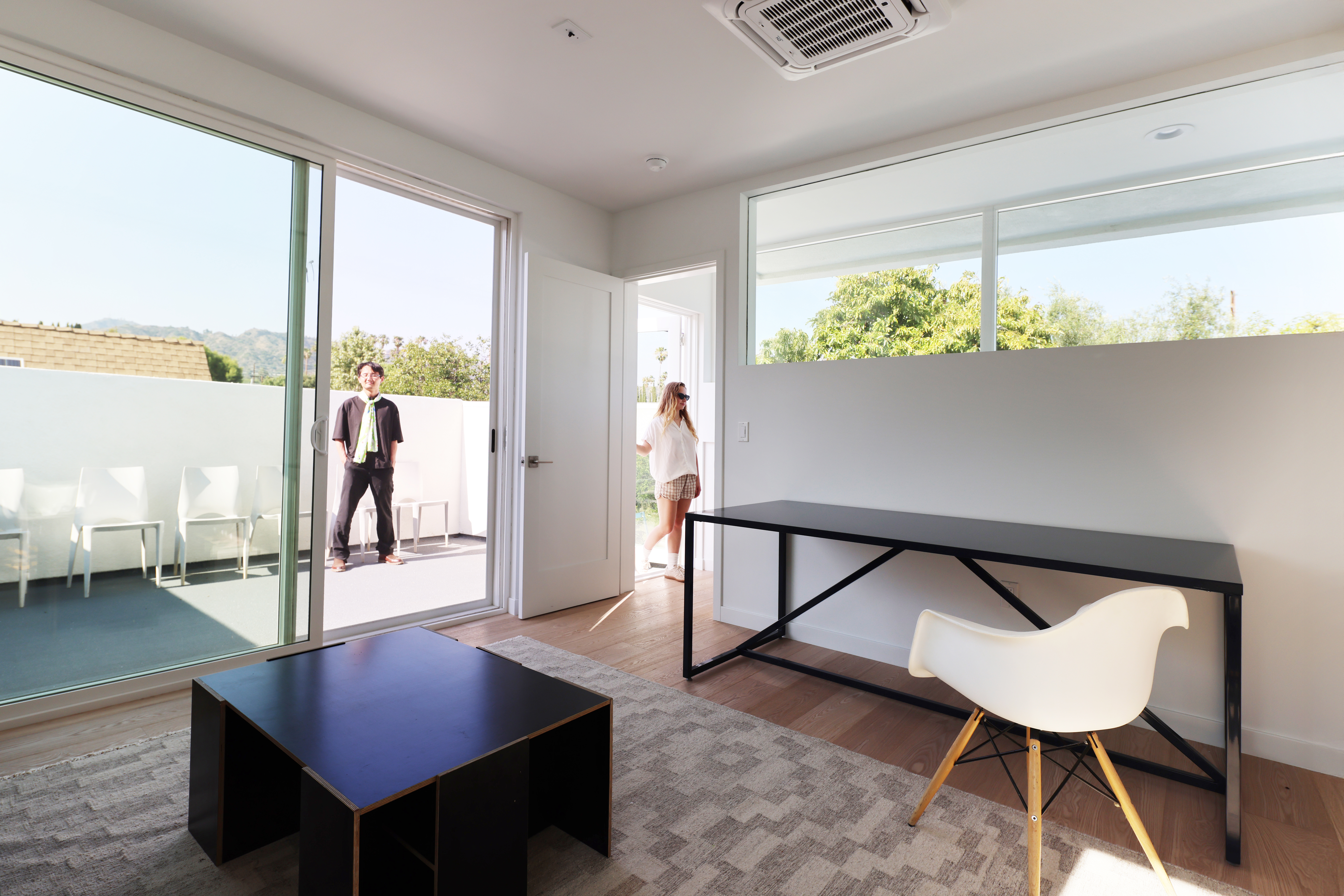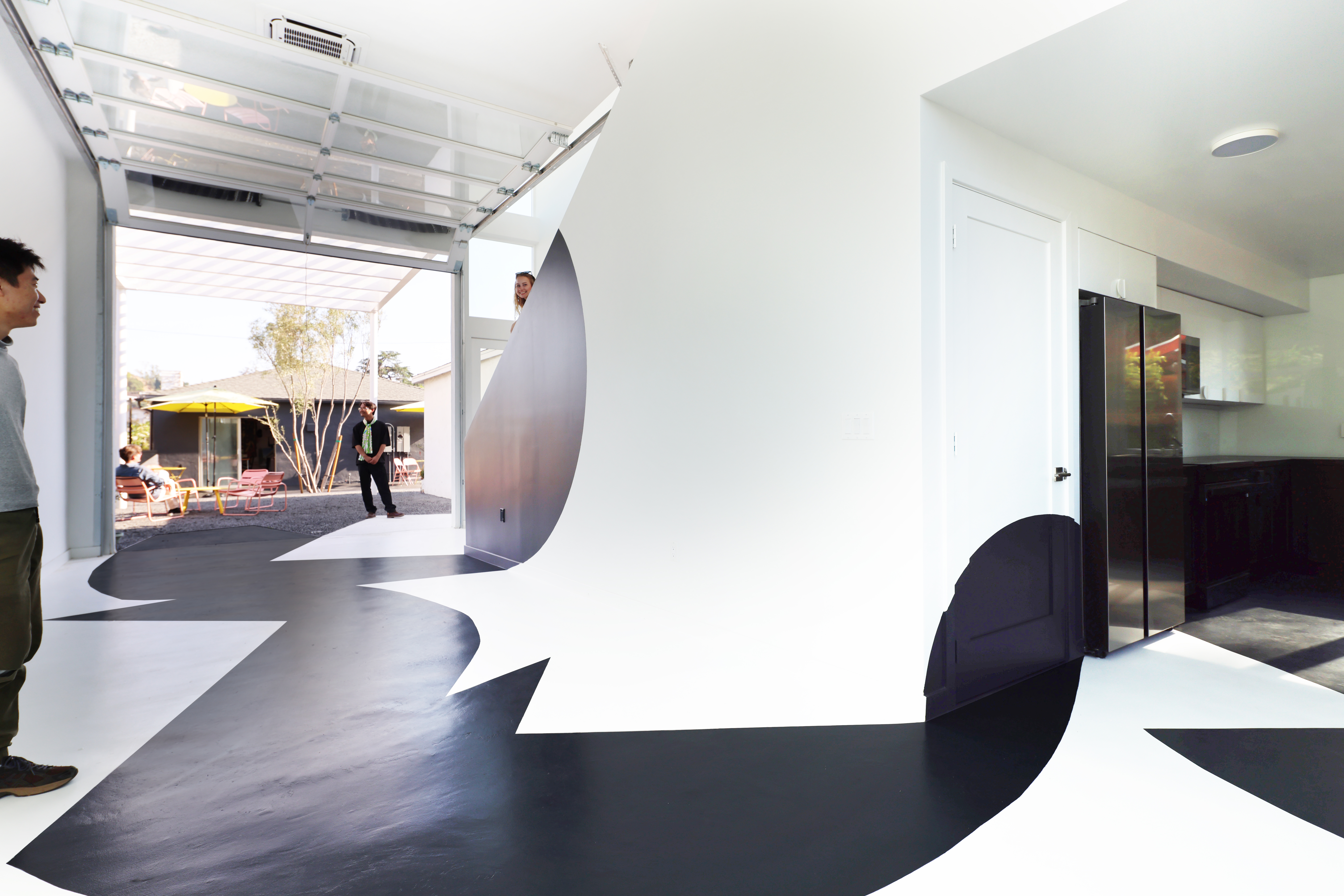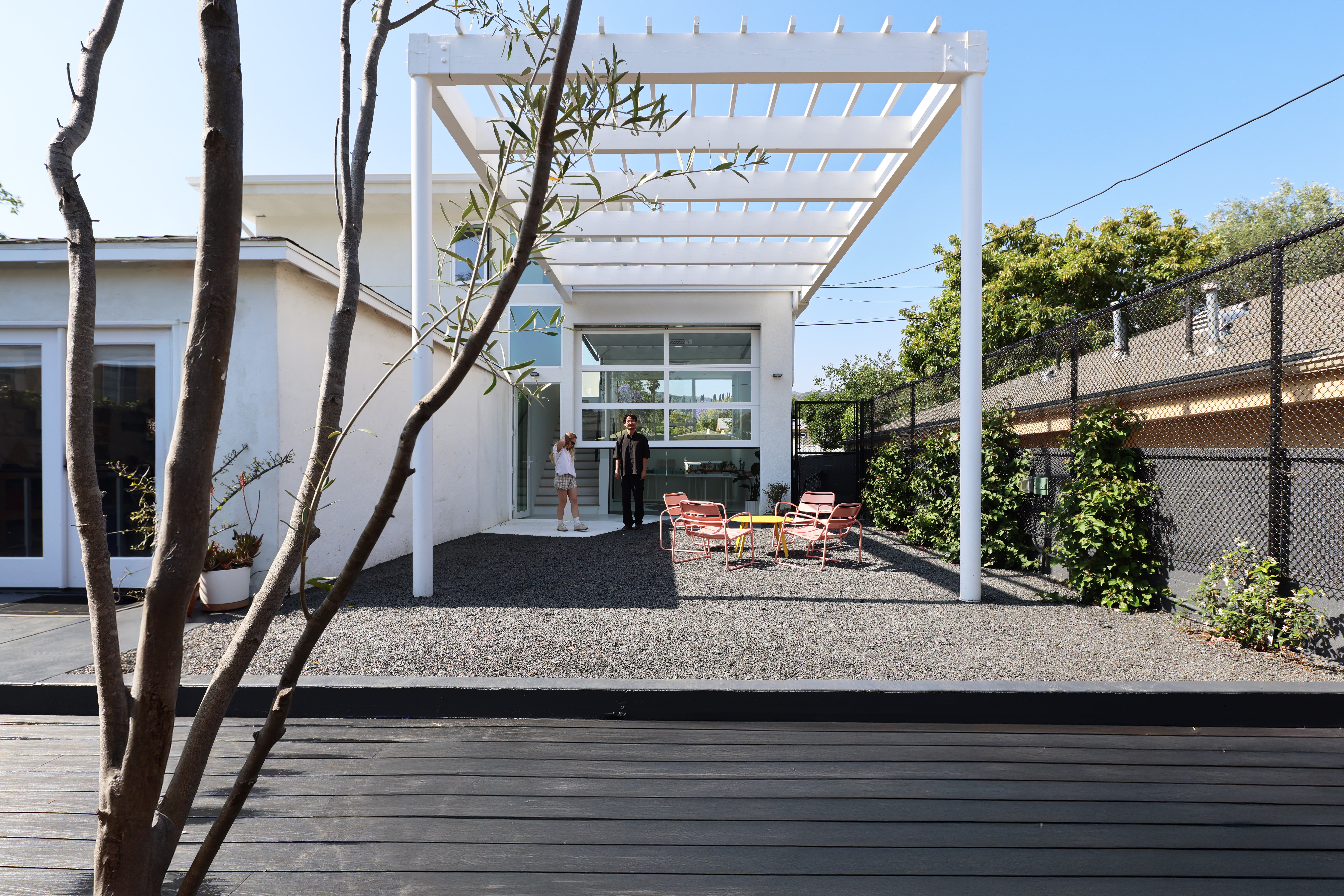 The new two-story structure features lofty ceilings, a wealth of north-facing natural light, and a 13-foot-tall shade armature to be used for future experiments. Carefully placed openings block out the foreground noise and focus the views on northeast LA hills and landscape, while the main space connects to the garden through a custom glass movable wall. A playful procession of painted shapes wind through the interior and spill into the courtyard blurring the line between indoors and out.