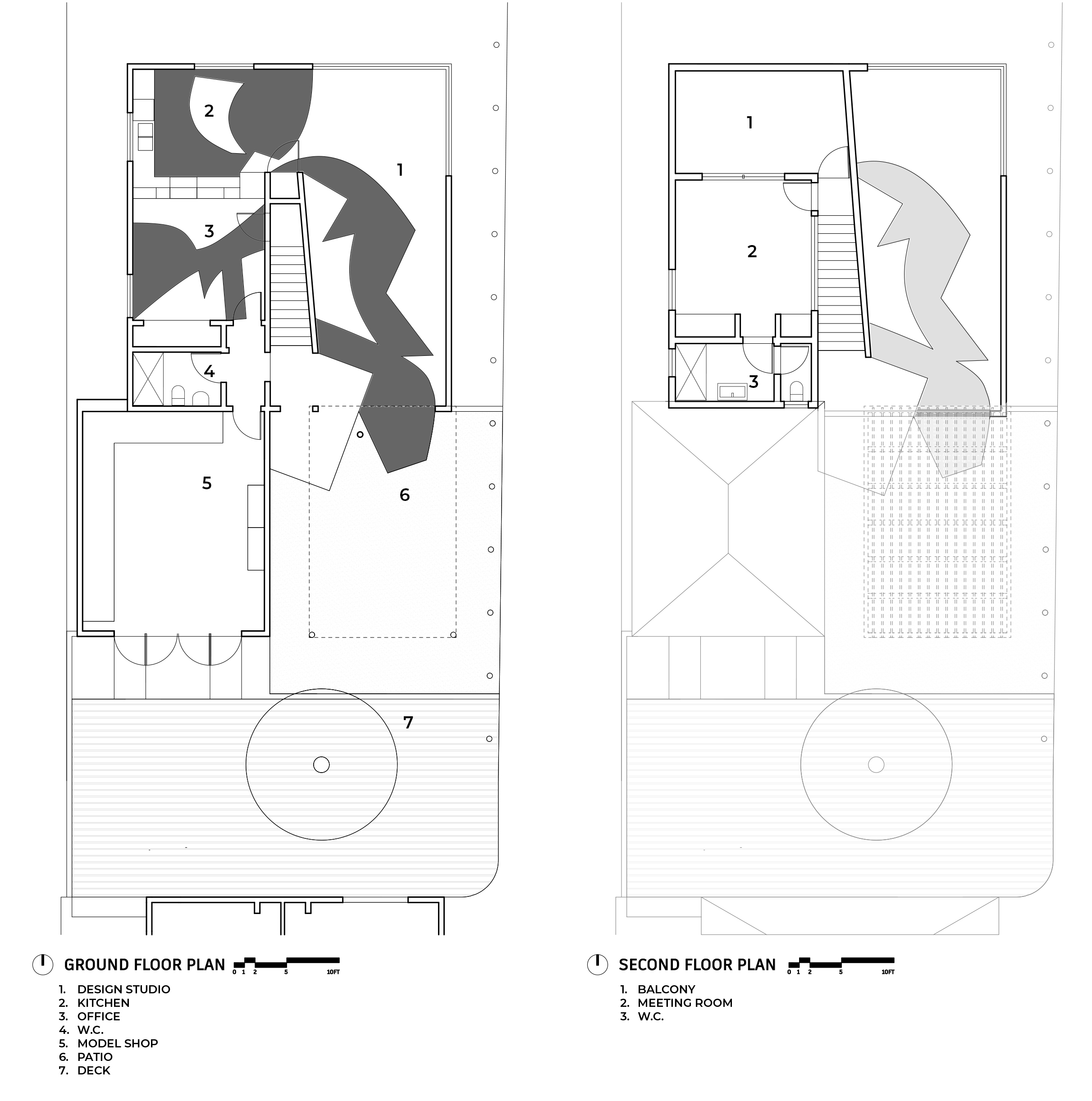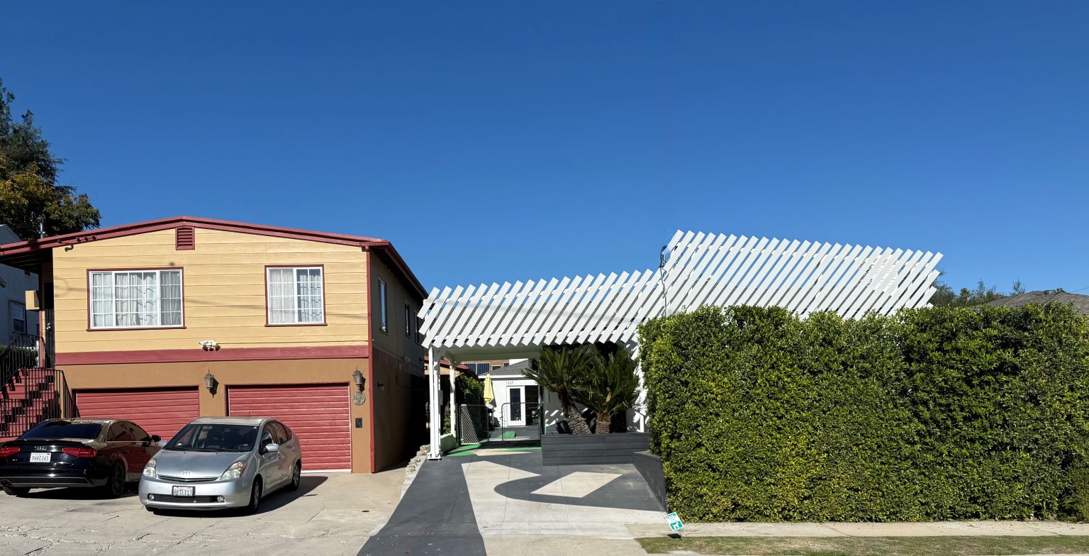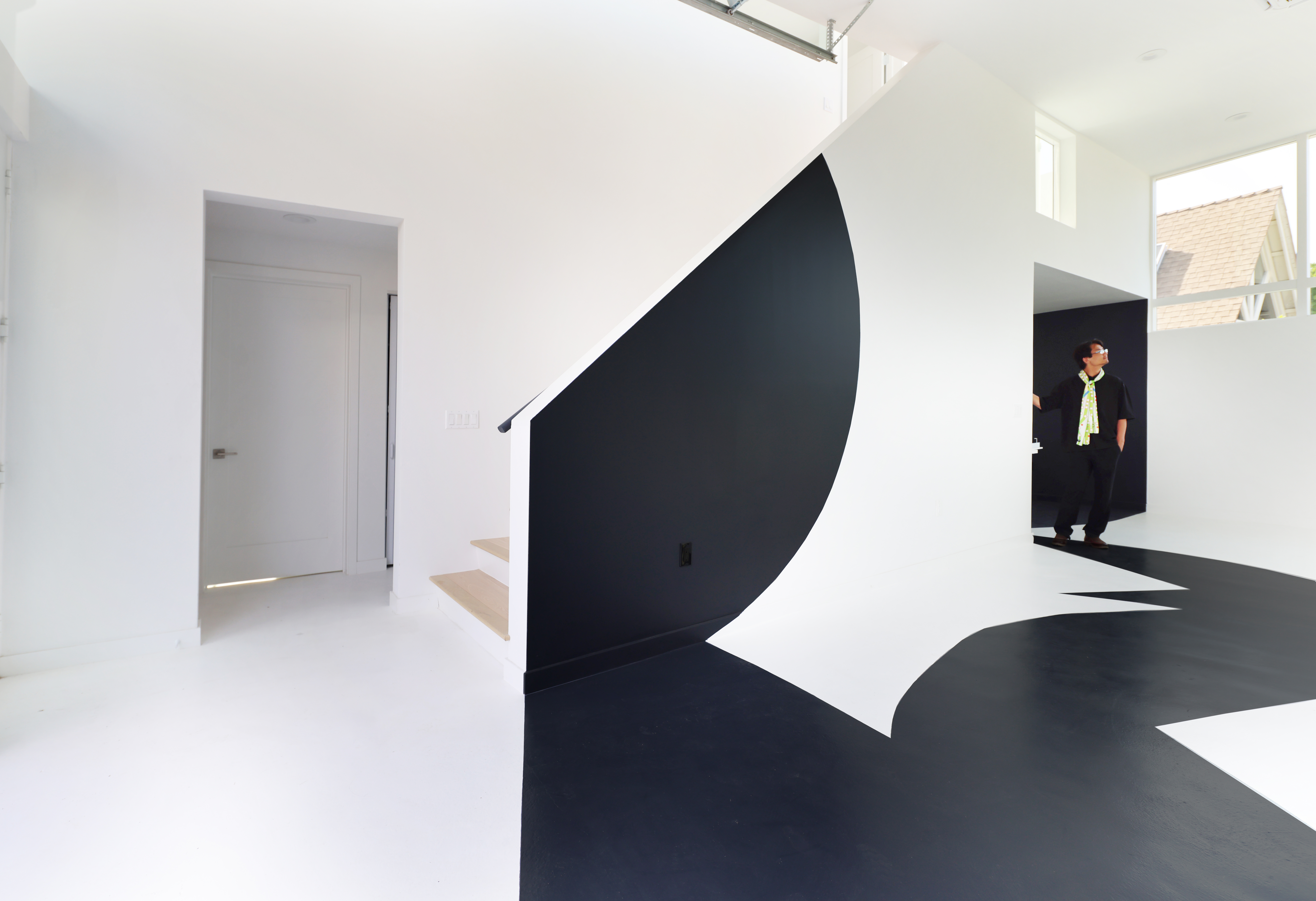 The new two-story structure features lofty ceilings, a wealth of north-facing natural light, and a 13-foot-tall shade armature to be used for future experiments. Carefully placed openings block out the foreground noise and focus the views on northeast LA hills and landscape, while the main space connects to the garden through a custom glass movable wall. A playful procession of painted shapes wind through the interior and spill into the courtyard blurring the line between indoors and out.