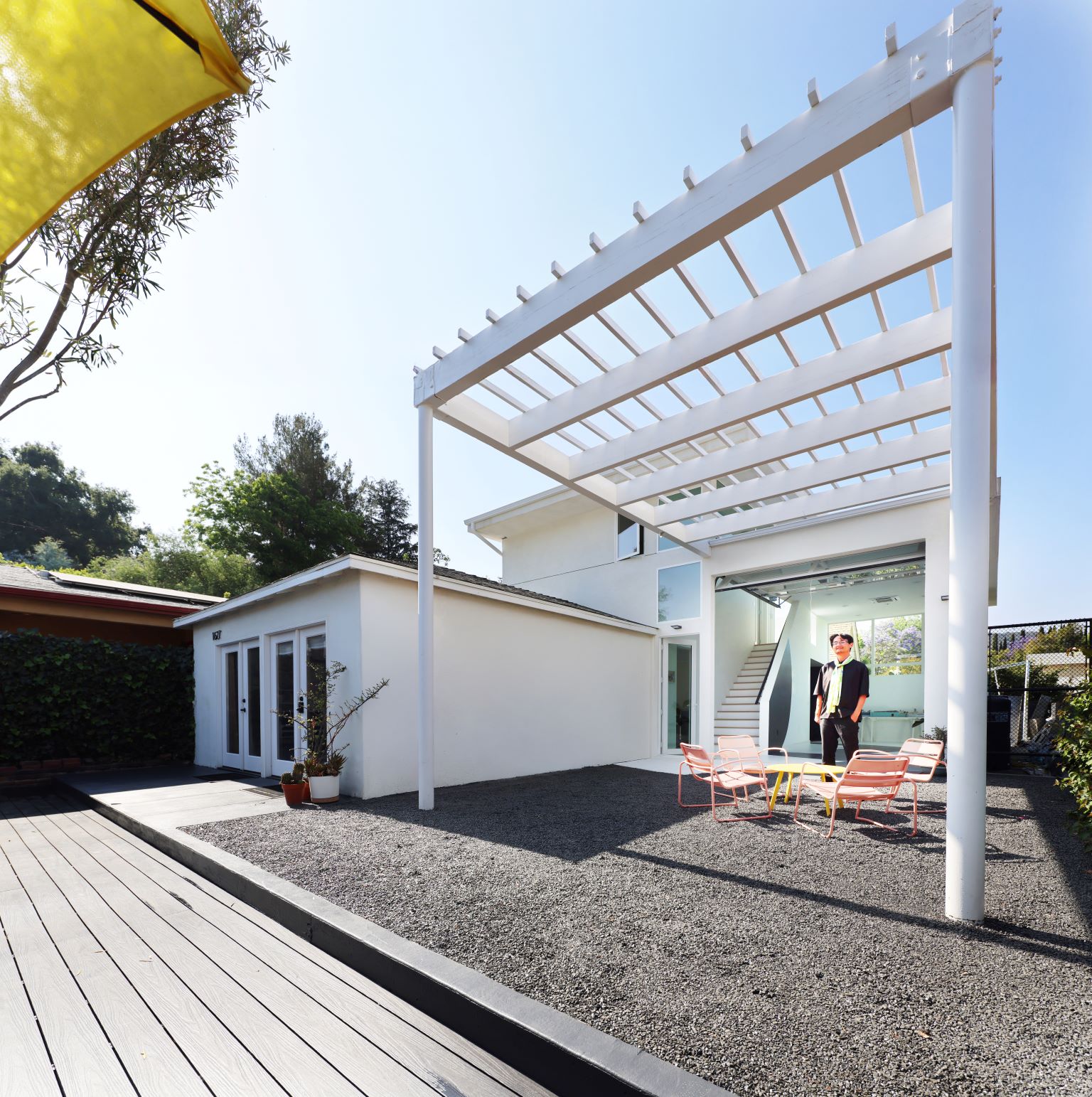 The outdoors is shaped with a Bougainvillea planted wall, murals, expansive new fire-resilient deck which resolves many levels of the existing garden, and the overhead trellis. This intervention transforms a part of the garden into an outdoor room.