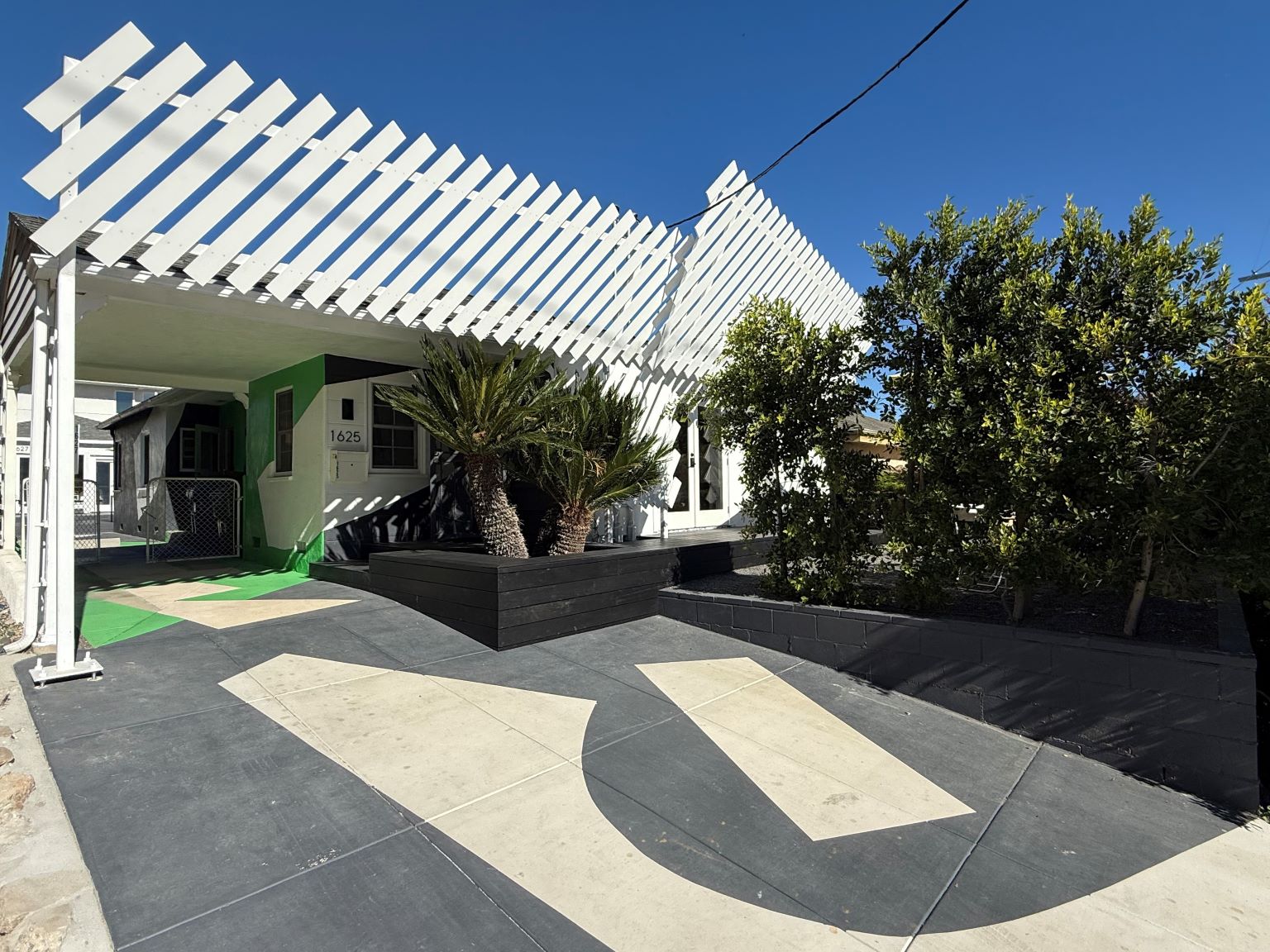 Playfully painted graphics that begin at the sidewalk draw you into the garden. Green and black pieces of ‘confetti’ play with the concept of positive and negative space, creating a striking composition along the ground and exterior walls of the existing building.